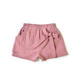 Cute little shorts with side bow and elastic waist. Adorable with a blouse and soft cardigan. Available in Navy or Grape.