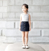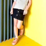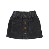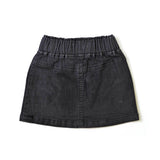 A-line black denim mini skirt with patch pockets and elastic waist. Decorated with lined buttons in front. Easy pairing with a t-shirt, blouse or turtle-neck. Denim is a tough, hardwearing fabric with a durable fit. Coupled with the soft qualities of natural cotton, this skirt is kept flexible and soft on the skin.