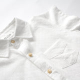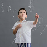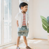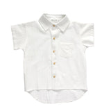 Boys' short sleeve button up shirt redesigned for comfort and style with Melon's signature boxy cut and functional chest pocket. Longer back hem adds a playful yet elegant accent for this staple piece. Best worn tucked out with a tailored bermuda shorts. Great for dressing up or down for all occasions.